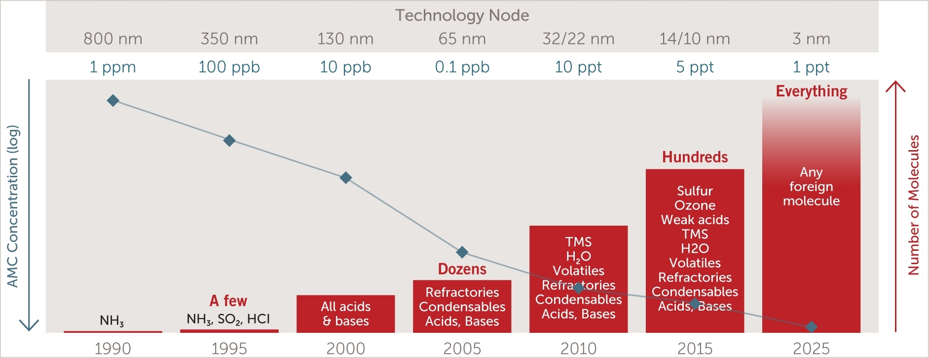 Today's fabs are manufacturing in cleaner environments as advanced processes are more AMC sensitive and there is a greater awareness of AMC impact. Early AMC concerns focused on few molecules only, at the ppm level. Over time, and particularly with 193 nm technology, more and more chemicals cause concerns, and with the advent of 14 to 7 nm critical dimensions, most gas-phase compounds can be a concern in certain process steps.