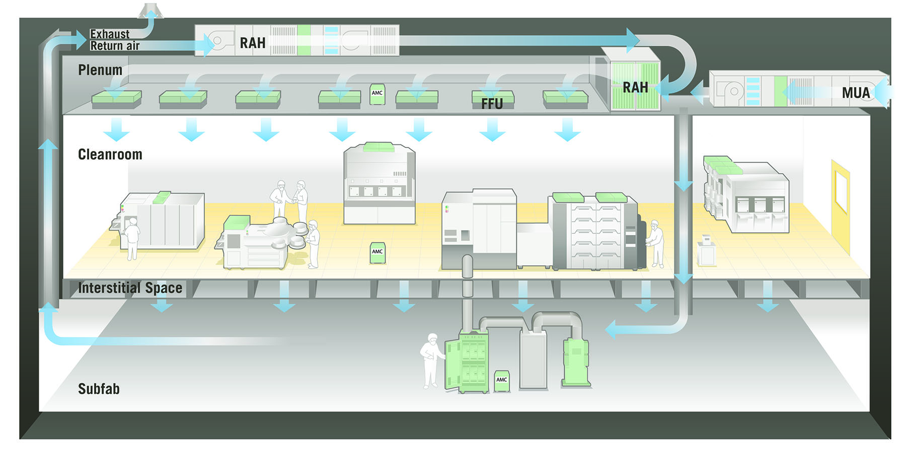 Microelectronics fabrication plants (fabs) are complex structures that require sophisticated air circulation and control. For management and energy savings, most of the conditioned air inside a fab is recirculated and may carry increasing amounts of contaminants that are produced internally, from humans, materials, chemicals, and equipment. About 5 – 20% of fresh air is provided from outside the fab, which may carry other potential contaminants. Small particles have been a well-controlled concern for decades, but modern microelectronics technology also requires a tight control of gas-phase, airborne molecular contamination (AMC) as it affects product, processes, and equipment. It is no longer possible to manufacture advanced semiconductors without AMC protection.
